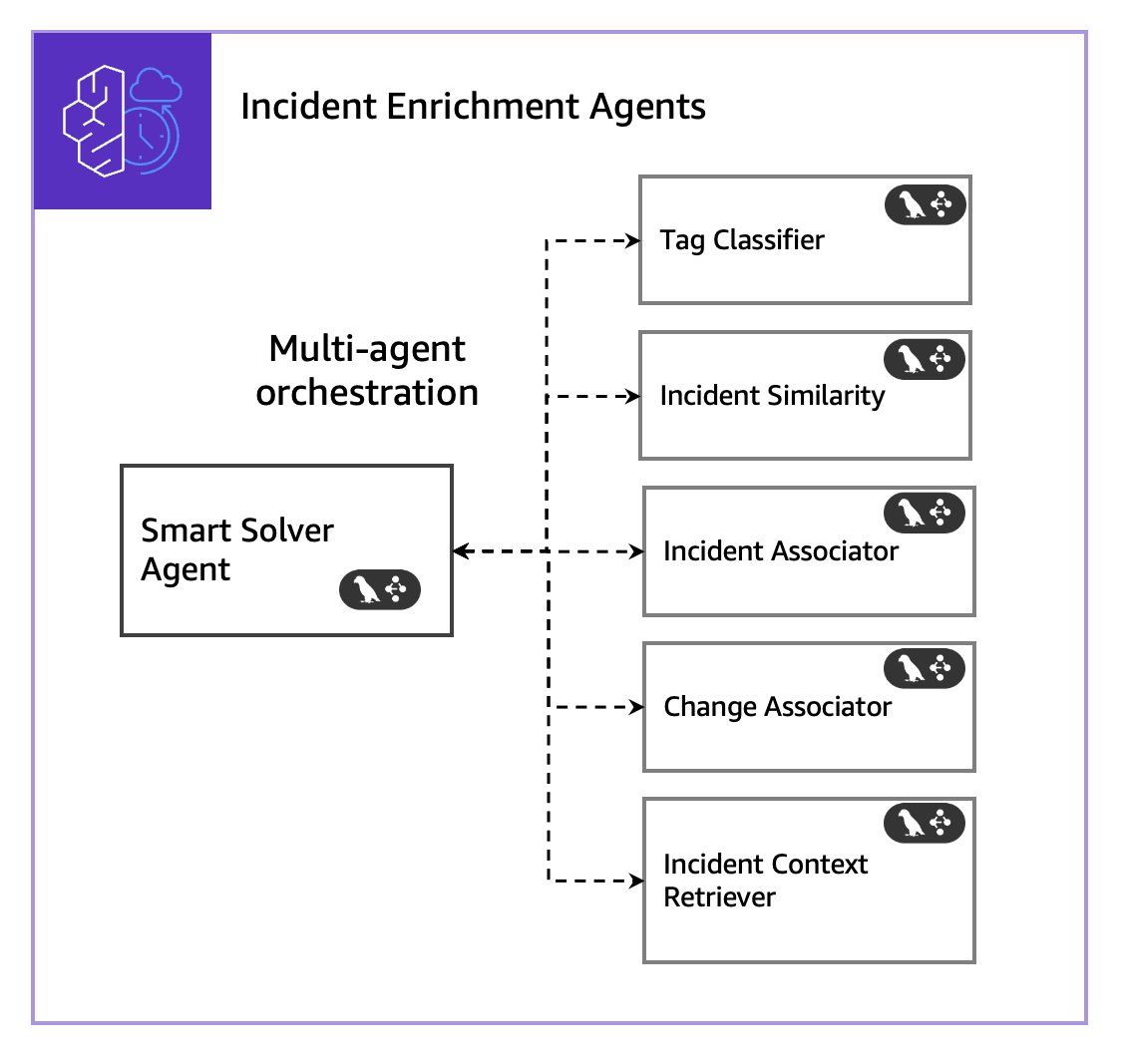 The second use case demonstrates intelligent multi-agent orchestration for incident management, where a Smart Solver Agent analyzes incoming incidents and selectively engages specialized agents based on contextual needs. This implementation adapts processing steps to each incident’s unique characteristics, optimizing resource utilization while providing comprehensive enrichment when needed.