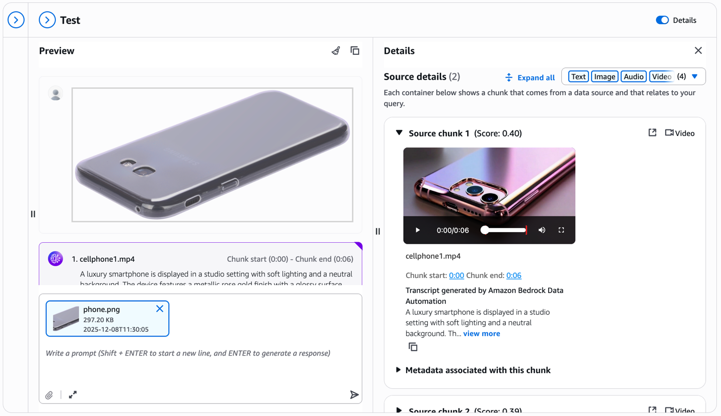 For each retrieved video chunk, Bedrock Data Automation automatically generates a detailed text description—in this example, describing the smartphone’s metallic rose gold finish, studio lighting, and visual characteristics. This transcript appears directly in the test window alongside the video, providing rich textual context. You get both visual similarities matching from the multimodal embeddings and detailed product descriptions that can answer specific questions about features, colors, materials, and other attributes visible in the video.