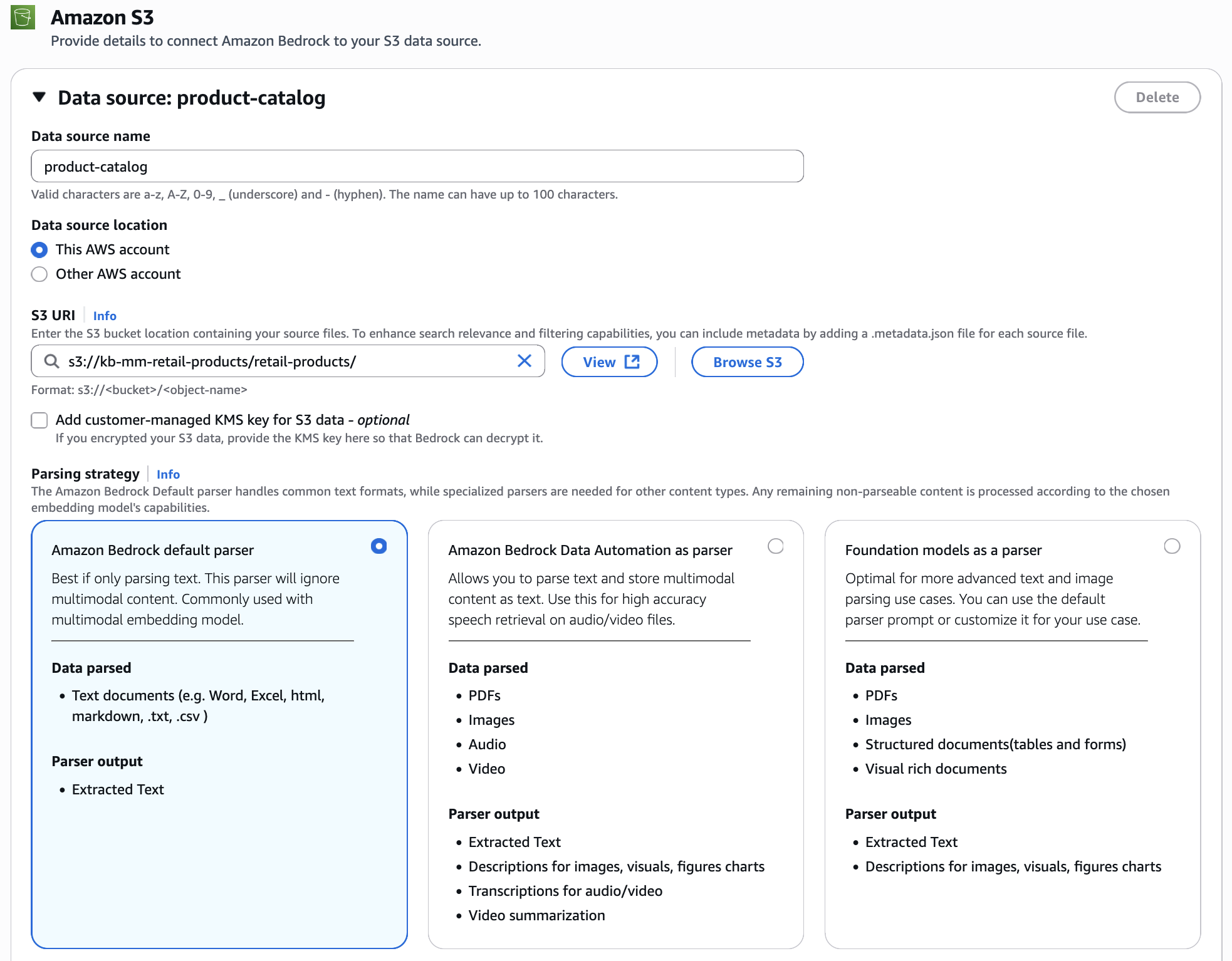 Connect your S3 bucket containing product images and videos. For the parsing strategy, select Amazon Bedrock default parser. Since we’re using Nova Multimodal Embeddings, the images and videos are processed natively and embedded directly into the unified vector space, preserving their visual characteristics without conversion to text.