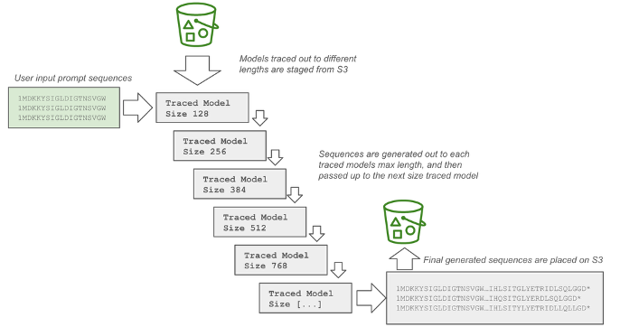 As shown in the following figure, within each individual batch job, sequences are generated by first loading the smallest bucket size from available traced models. Sequences are generated out to the max tokens for that bucket, and sequences that were generated with a stop codon or a start codon are dropped. The remaining unfinished sequences are passed up to subsequently larger bucket sizes for further generation, until the parameter max_length
