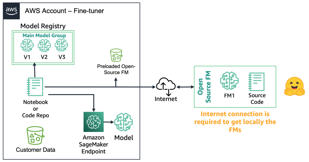 With open-source FMs, fine-tuners can download the model artifact and source code from repositories such as Hugging Face Model Hub. This enables them to fine-tune the model, register it locally, and deploy it to an Amazon SageMaker endpoint (requires internet connection). For secure environments like financial services, the model can instead be downloaded on premises, scanned for security, and uploaded to a local AWS bucket. Fine-tuners then work from the local copy without internet connectivity, ensuring data privacy and compliance. The following diagram illustrates this method.