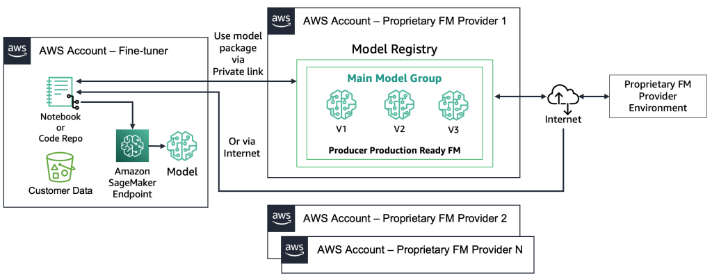With proprietary FMs, the deployment process is different because the fine-tuners don’t have access to the model artifact or source code. The models are stored in proprietary FM provider AWS accounts and model registries. To deploy such a model to a SageMaker endpoint, the fine-tuners can request only the model package that will be deployed directly to an endpoint. This process requires customer data to be used in the proprietary FM providers’ accounts, which raises questions regarding customer-sensitive data being used in a remote account to perform fine-tuning, and models being hosted in a model registry that is shared among multiple customers. This leads to a multi-tenancy problem that becomes more challenging if the proprietary FM providers need to serve these models. If the fine-tuners use Amazon Bedrock, these challenges are resolved—the data doesn’t travel over the internet and the FM providers don’t have access to fine-tuners’ data. The same challenges hold for the open-source models if the fine-tuners want to serve models from multiple customers, such as the example we gave earlier with the website that thousands of customers will upload personalized images to. However, these scenarios can be considered controllable because only the fine-tuner is involved. The following diagram illustrates this method.