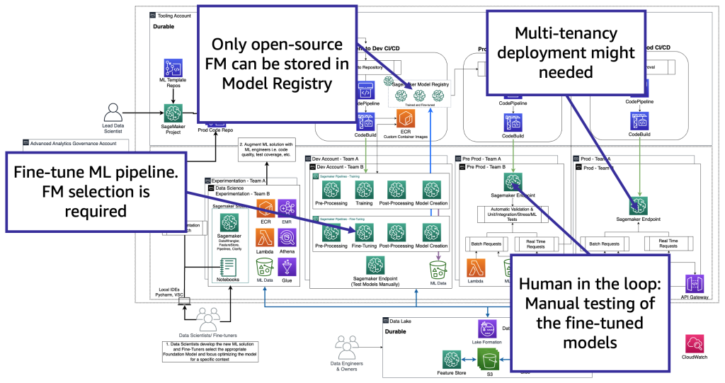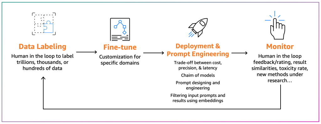 Fine-tuners adapt foundation models to specific business contexts, often acting as consumers too, requiring them to manage all layers – from generative AI app development to data lakes, data meshes, and MLOps. The following figure illustrates the complete FM fine-tuning lifecycle that the fine-tuners need to provide the generative AI end-user.