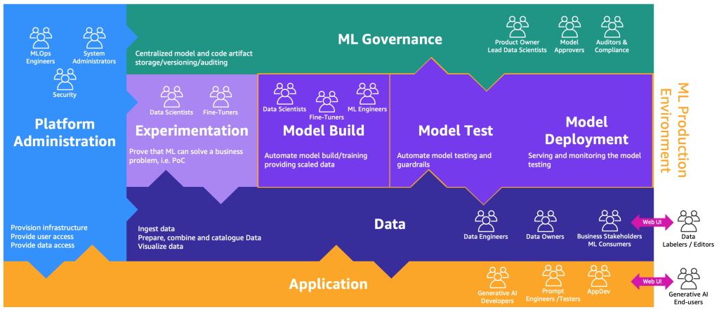 - Consumers – Users who access generative AI through prompts or visual interfaces to accomplish tasks. They do not need ML expertise, as they are typically application developers or end-users who understand the service’s capabilities. Effective use relies mainly on prompt engineering to achieve better outcomes.