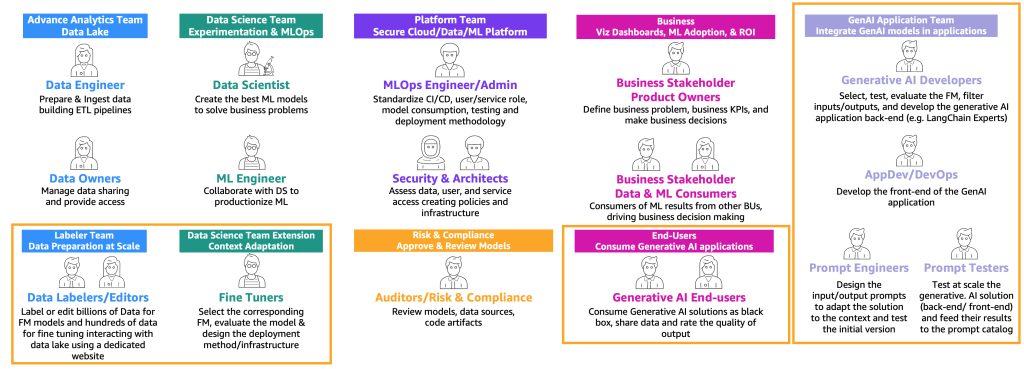 - Generative AI developers: They have deep knowledge on selecting FMs, chaining prompts and applications, and filtering input and outputs. They belong a new team—the generative AI application team.