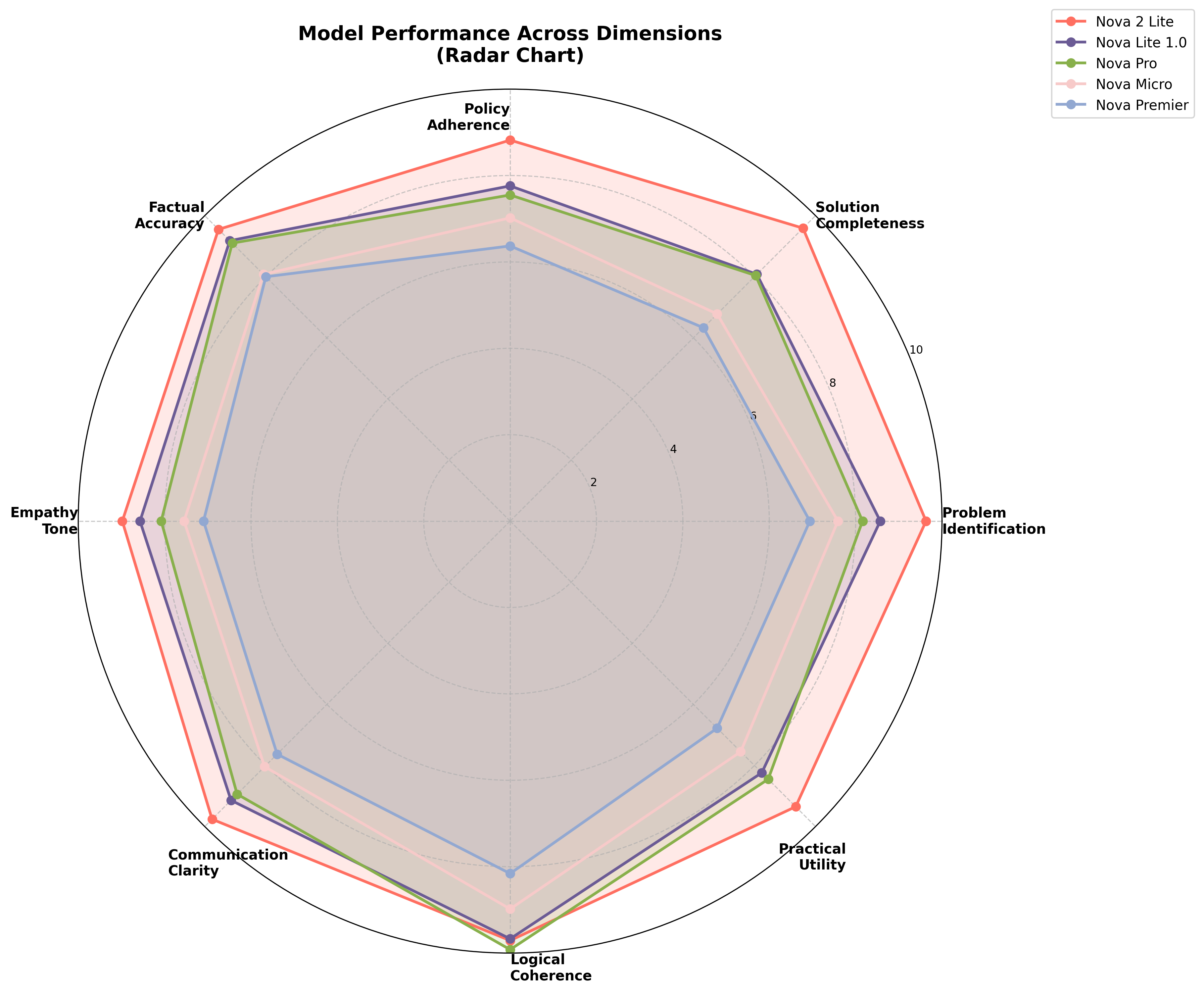 - Multi-dimensional reasoning matters: Models scoring well on accuracy but poorly on empathy or clarity are unsuitable for customer-facing applications. The balanced performance of Nova Lite 2 across all dimensions makes it production-ready.