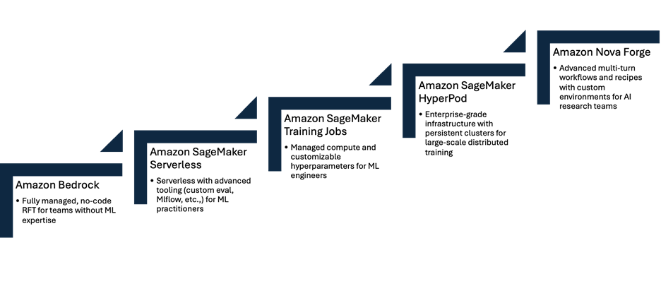 Amazon offers multiple implementation paths for reinforcement fine-tuning with Nova models, ranging from fully managed experiences to customizable infrastructure. By following this tiered approach you can match your RFT implementation to your specific needs, technical expertise, and desired level of control.