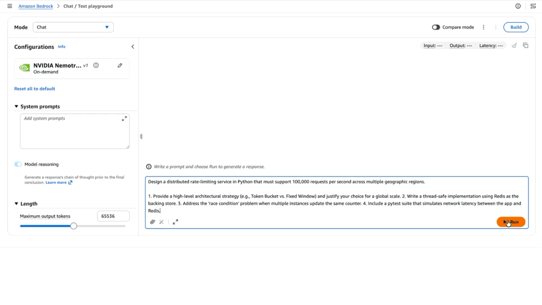 After completing the previous steps, you can test the model immediately. To truly showcase Nemotron 3 Super’s capability, we will move beyond simple syntax and task it with a complex engineering challenge. High-reasoning models excel at “system-level” thinking where they must balance architectural trade-offs, concurrency, and distributed state management.