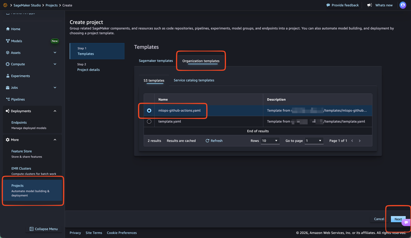 After you follow the instructions in the repository you can find the mlops-github-actions template in the SageMaker AI Projects section in the SageMaker AI Studio console by choosing Projects from the navigation pane and selecting the Organization templates tab and choosing Next, as shown in the following image.