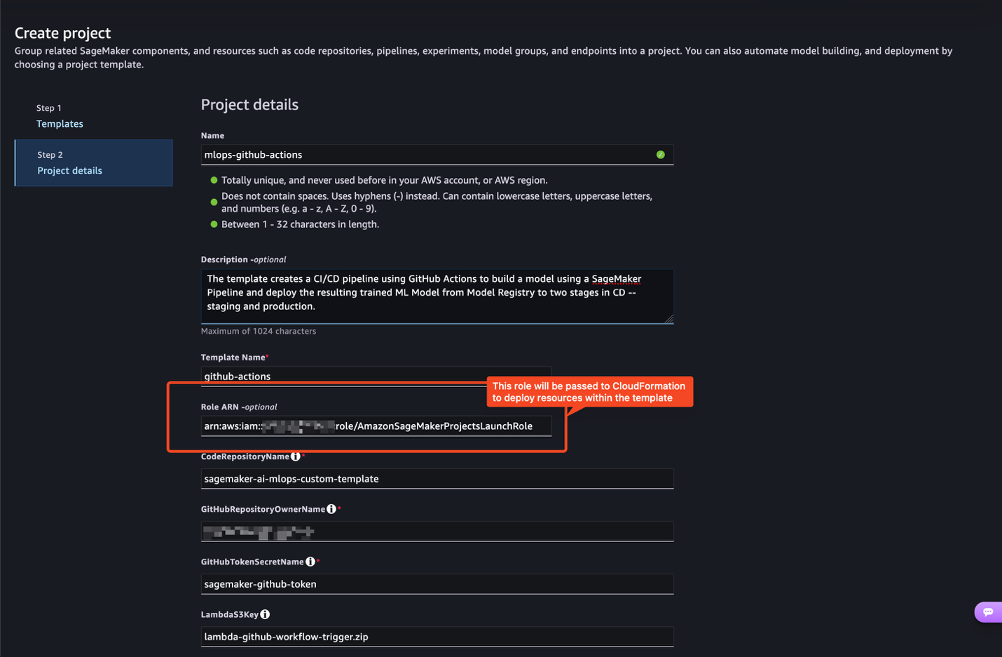 Enter your desired project configuration details and choose Next. The template will then create two automated ModelOps workflows—one for model building and one for model deployment—that work together to provide CI/CD for your ML models. The complete ModelOps example can be found in the mlops-github-actions repository.