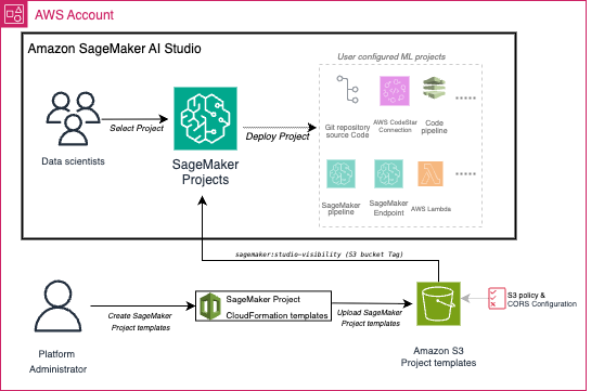 The S3-based ModelOps projects support custom CloudFormation templates that you create for your organization ML use case. AWS-provided templates (such as the built-in ModelOps project templates) continue to be available exclusively through Service Catalog. Your custom templates must be valid CloudFormation files in YAML format. To start using S3-based templates with SageMaker AI Projects, your SageMaker domain (the collaborative workspace for your ML teams) must include the tag sagemaker:projectS3TemplatesLocation with value s3://<bucket-name>/<prefix>/. Each template file uploaded to S3 must be tagged with sagemaker:studio-visibility=true to appear in the SageMaker AI Studio Projects console. You will need to grant read access to SageMaker execution roles on the S3 bucket policy and enable CORS onfiguration on the S3 bucket to allow SageMaker AI Projects access to the S3 templates.