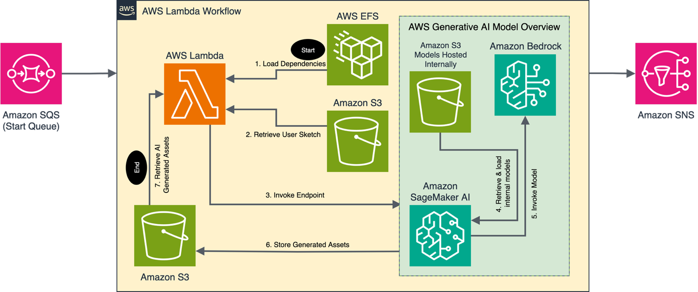 With the above constraints in mind, we designed the system with a serverless-first architecture approach for most of the workload. We deployed HuggingFace models on Amazon SageMaker AI and used available models in Amazon Bedrock, creating a comprehensive inference pipeline that used the flexibility and strengths of both services. Amazon Bedrock offered simplified and managed access to foundation models such as Anthropic Claude, Amazon Nova, Stable Diffusion and Amazon SageMaker AI provided complete machine learning lifecycle control for open source models from HuggingFace.