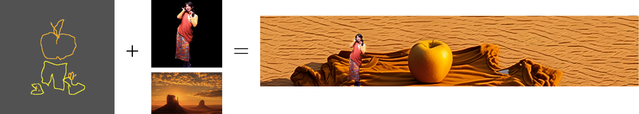The following image is an example of assets used and produced by one of the modules. User sketch is on the left, actor photo is on top, reference background image is on the bottom, and the AI generated image on the right.