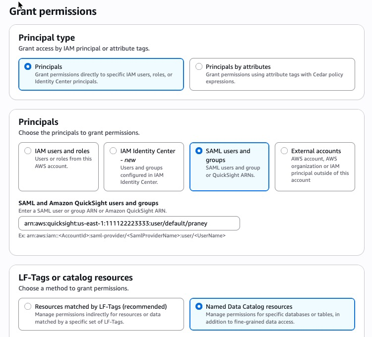 - Console role with permissions to create the dataset in S3, run Athena queries, create Glue catalog, Lake Formation admin privileges, and access Quick features. To decide the relevant policy/policies reference policy document.