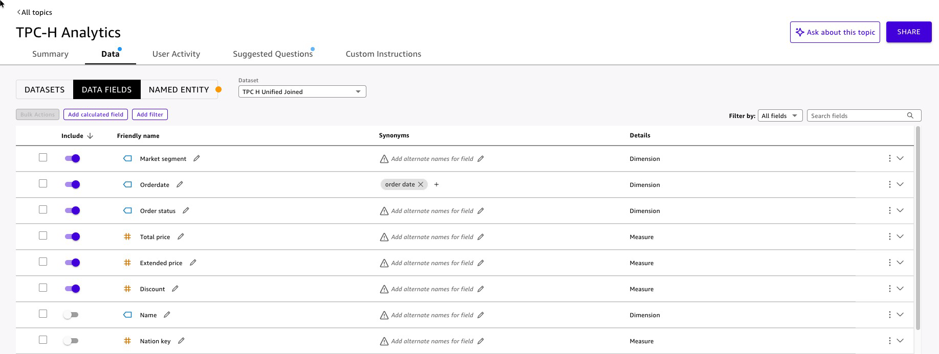 - Dataset – We utilized Amazon Athena connection from Amazon Quick to extract structured data to load in Quick SPICE (Super-fast, Parallel, In-memory Calculation Engine) dataset