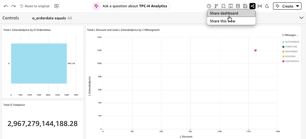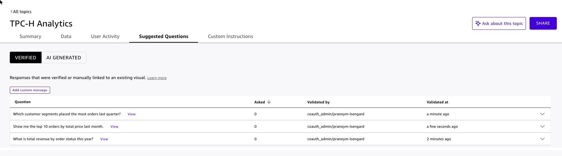 TPC-H Lakehouse Analytics(the dashboard configured in the Dashboard Build and Publish with Amazon Q section) - The agent can reference dashboard visuals and direct users to specific views when answering questions.
