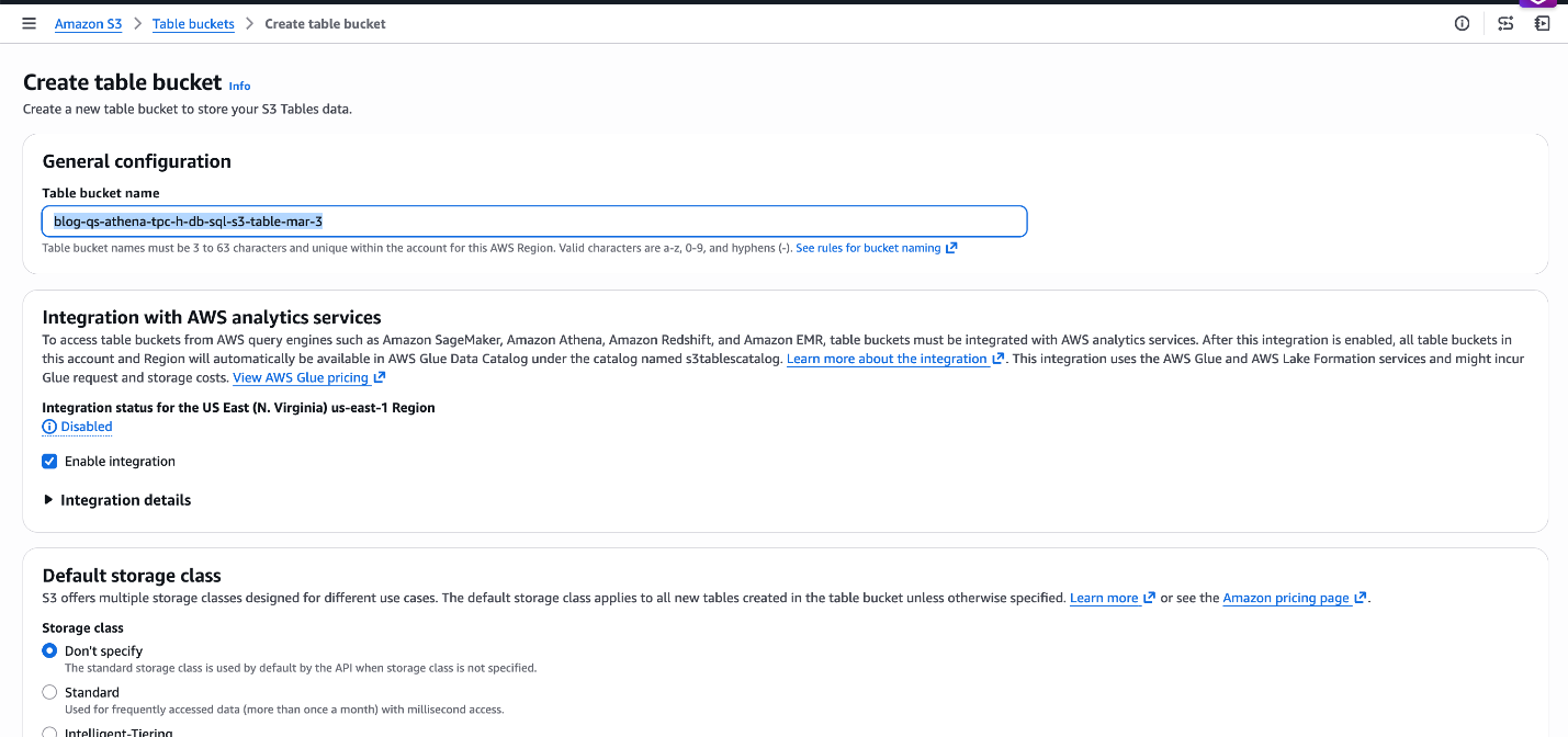 Figure 6: Create S3 Table bucket blog-qs-athena-tpc-h-db-sql-s3-table-mar-3