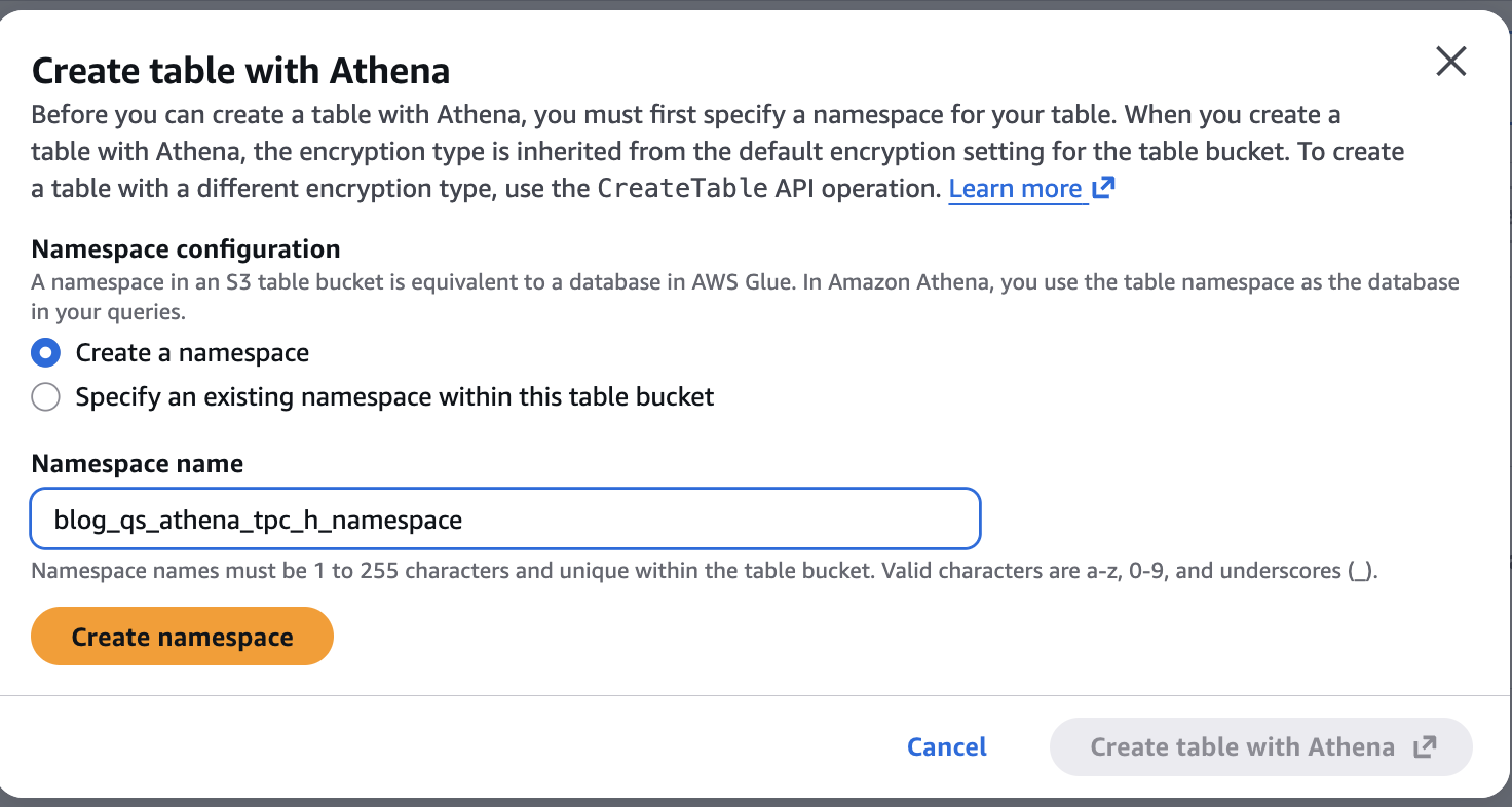 Step1: Create the S3 Table Bucket and Namespace – Navigate to S3 → Table Buckets in the AWS Console to create the bucket blog-qs-athena-tpc-h-db-sql-s3-table-mar-3 and namespace. Alternatively, use the AWS CLI for scripted setup.