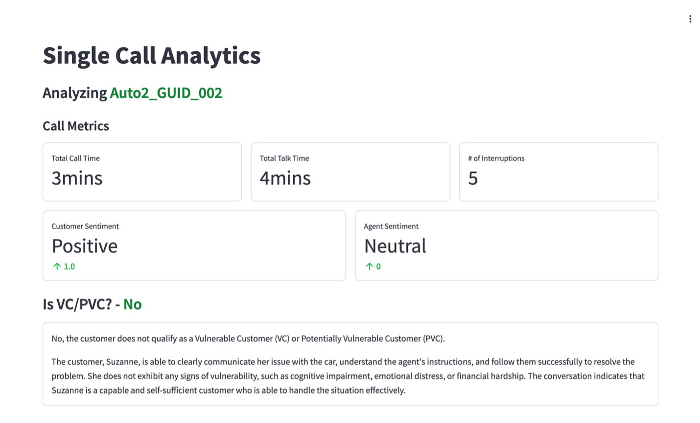 A vulnerable customer or potentially vulnerable customer is someone who, due to their personal circumstances, is particularly susceptible to financial harm or requires special consideration in financial services. The application assesses whether the customer calling in might be considered vulnerable or potentially vulnerable, by passing the call transcript of the selected call with the following prompt: