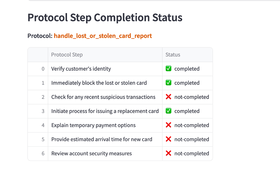 This code snippet shows how the application first identifies the relevant protocol using the call transcript and a list of available protocols. After the protocol has been identified, the call transcript and protocol steps for the determined protocol are passed together to check if each step of the protocol was completed by the agent. The results are displayed in a user-friendly format, helping managers quickly assess agent performance and adherence to guidelines.