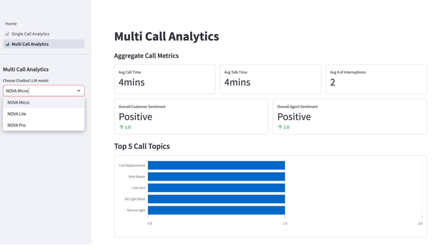 The “Top 5 Call Topics” visual in the preceding screenshot is also powered by Amazon Nova models; users can classify the call’s topic from passing in the call transcript and then letting the model determine what the main topic of the call was. This feature can help users quickly classify calls and place them in the bucket of the determined topic to generate visuals. By seeing the top reasons customers are calling in, businesses can focus on devising strategies to reduce call volumes for these topic categories. Additionally, the application provides flexible model selection options, so users can choose between different Amazon Nova models (such as Nova Pro, Nova Lite, and Nova Micro) for various analytical tasks. This flexibility means users can select the most appropriate model for their specific needs and use cases.
