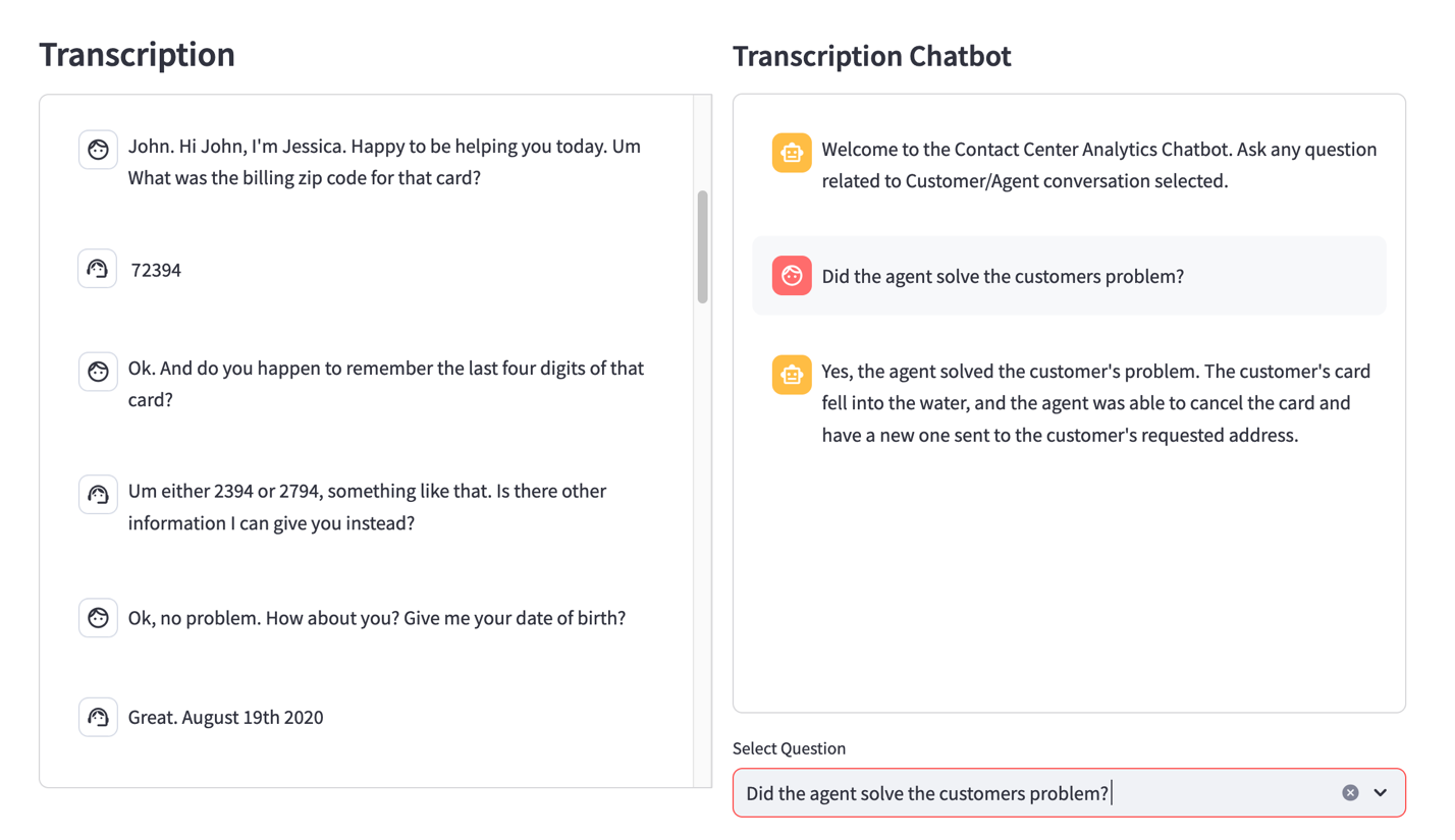 The Single Call Analytics page provides an interactive transcription view, so users can read through the conversation between the agent and customer. Additionally, it includes an AI assistant feature so users can ask specific questions about the call: