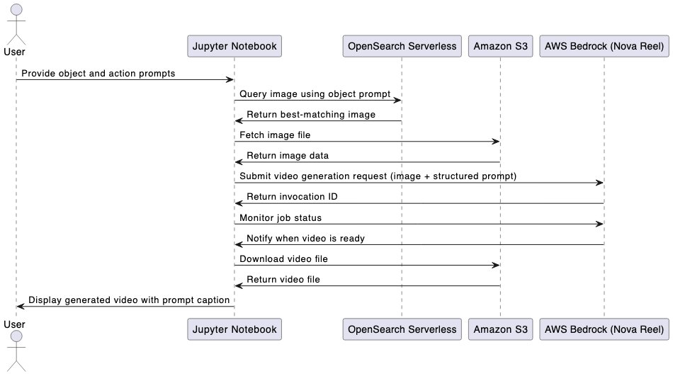 To address this, we developed a Video Retrieval Augmented Generation (VRAG) multimodal pipeline that transforms structured text into bespoke videos using a library of images as reference. Using Amazon Bedrock, Amazon Nova Reel, the Amazon OpenSearch Service vector engine, and Amazon Simple Storage Service (Amazon S3), the solution seamlessly integrates image retrieval, prompt-based video generation, and batch processing into a single automated workflow. Users provide an object of interest, and the solution retrieves the most relevant image from an indexed dataset. They then define an action prompt (for example, “Camera rotates clockwise”), which is combined with the retrieved image to generate the video. Structured prompts from text files allow multiple videos to be generated in one execution, creating a scalable, reusable foundation for AI-assisted media generation.