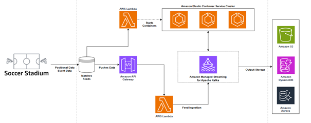 The BMF framework processes real-time data through Amazon Managed Streaming for Apache Kafka (Amazon MSK), enabling seamless integration of positional data streaming at 25 Hz alongside event data from the DFL DataHub. The Sportec Solutions Match Momentum calculation engine operates within a dedicated AWS Fargate container. It continuously processes incoming data throughout each match in real time.