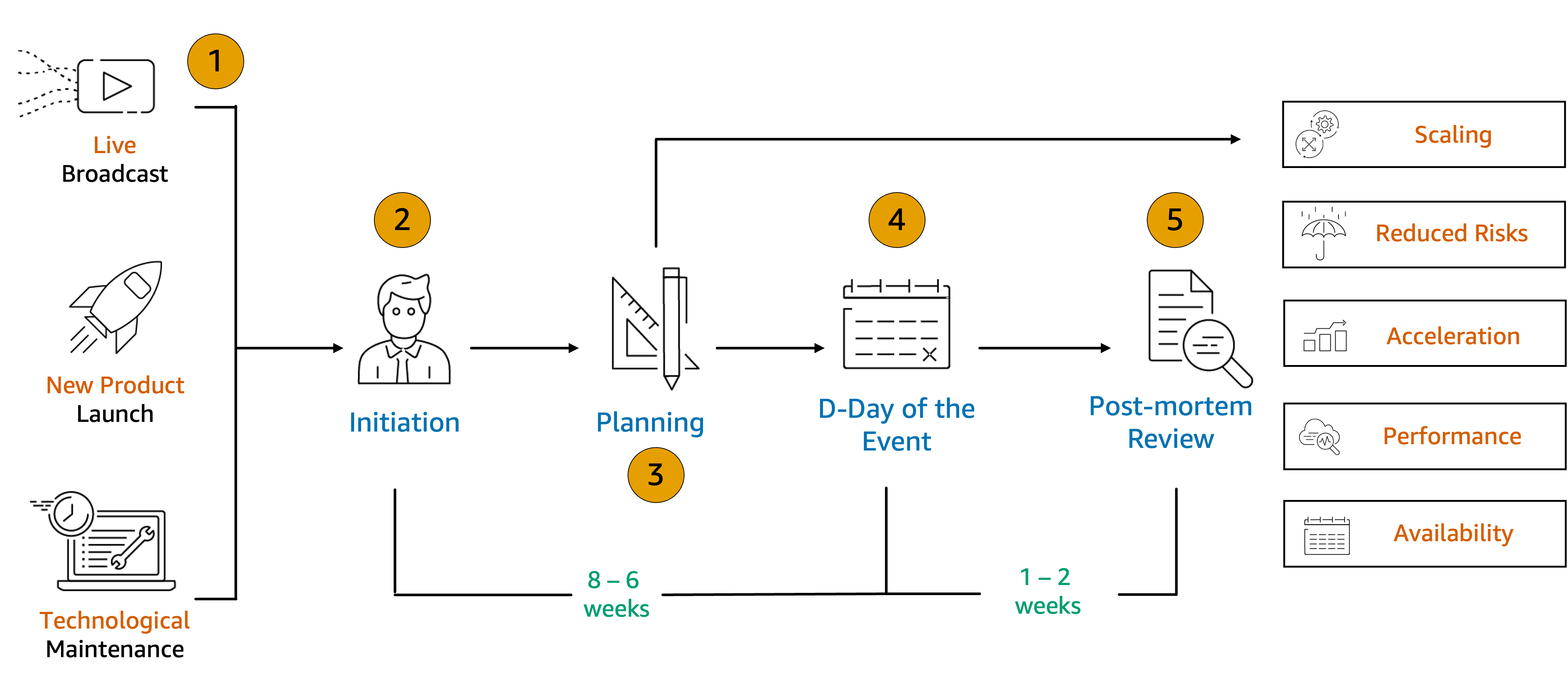 ![AWS Countdown Program's five steps: (1) Large-scale event definition (represented by the Live [Broadcast], New Product [Launch] and Technological [Maintenance]), (2) Initiation, (3) Planning, (4) D-Day of the Event (steps 2-4 have a timeline of 8-6 weeks noted), (5) Post-mortem Review (steps 4-5 have a timeline of 1-2 weeks noted). Timeline: 8-6 weeks preparation. Benefits listed: Scaling, Reduced Risks, Acceleration, Performance, Availability.](https://d2908q01vomqb2.cloudfront.net/fb644351560d8296fe6da332236b1f8d61b2828a/2025/10/27/AWS-countdown.png)