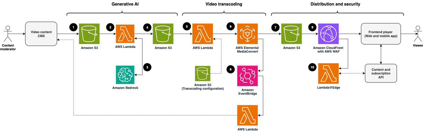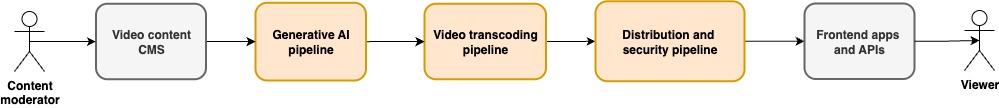 The Dramaze platform’s content delivery workflow is architected around three distinct pipelines: generative AI, video transcoding, and distribution. The design allows for scaled processing of thousands of short-form videos with AI enhancement. This workflow is shown in the following diagram.