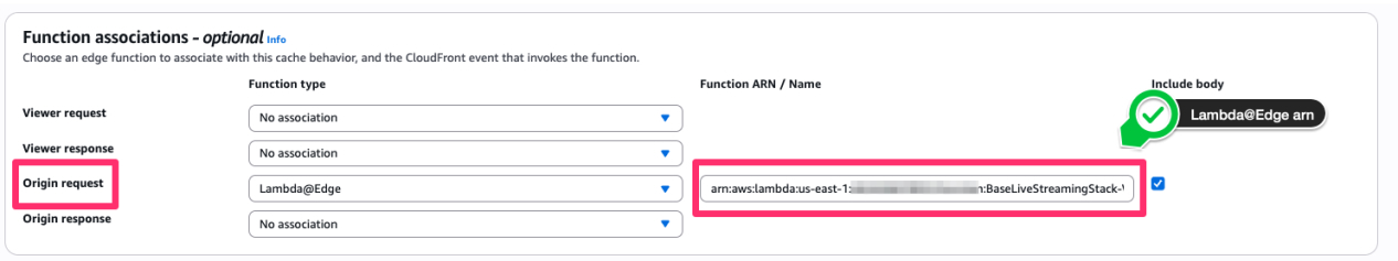 The following figure shows the Lambda@Edge association configuration in CloudFront, which enables real-time VTT chunk interception.