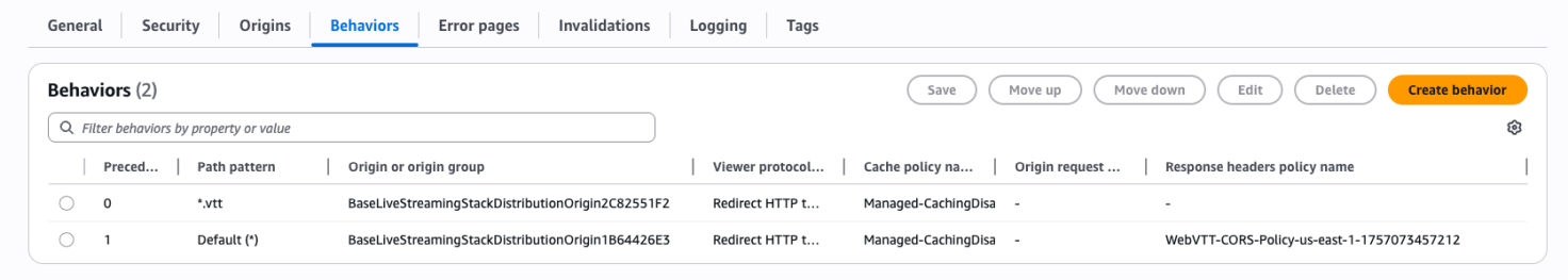 The second CloudFront distribution is for traditional media delivery to viewers and has two origins configured using the Behaviors tab: