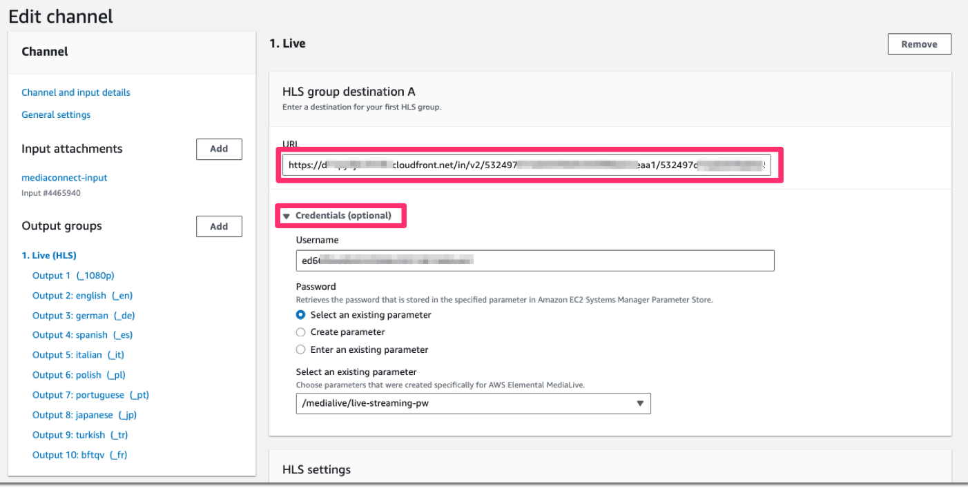 For the MediaLive HLS group destination URL, the format should be ‘{CloudFrontUrl}/in/v2/{HLS ingest endpoint id}/{HLS ingest endpoint id}/channel’. Credentials required to access the group destination are automatically generated when the CloudFormation stack is deployed