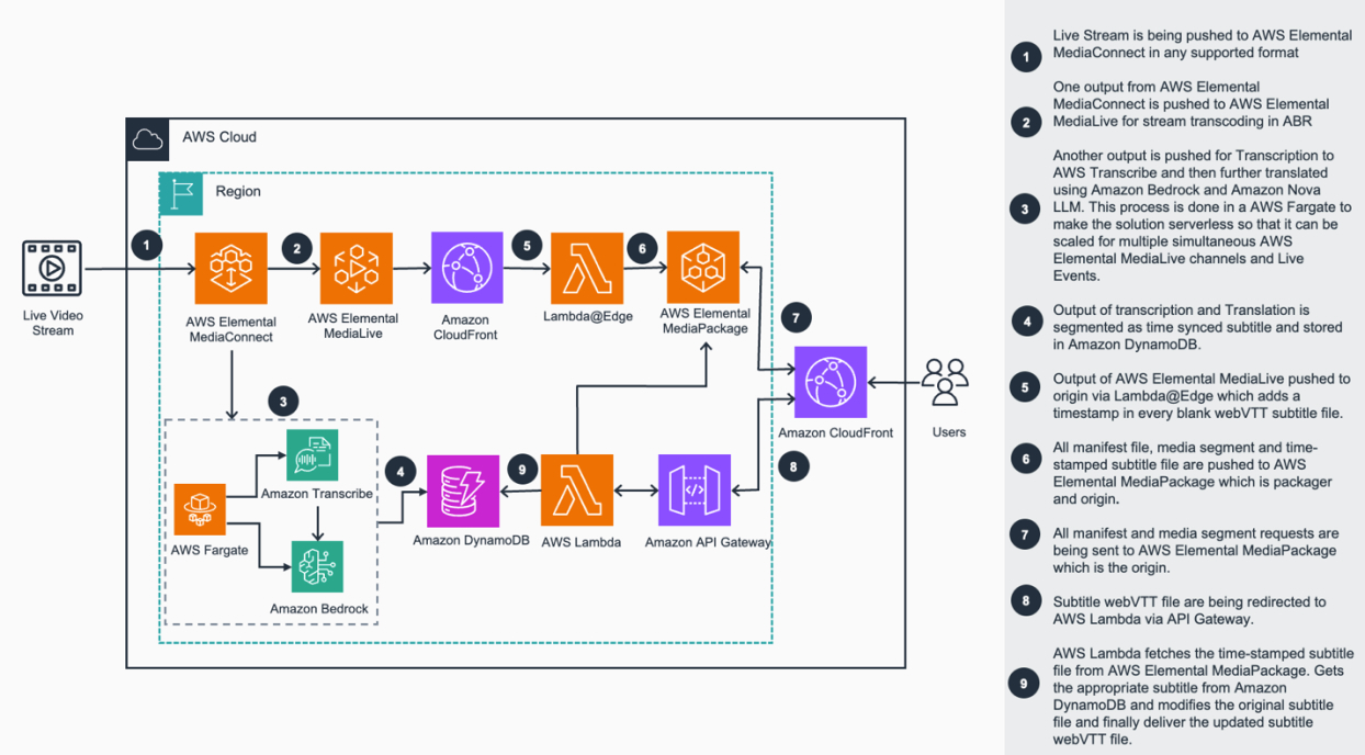 AWS provides a comprehensive suite of services that work together seamlessly to deliver real-time multilingual subtitles without compromising quality or scalability. The solution uses: