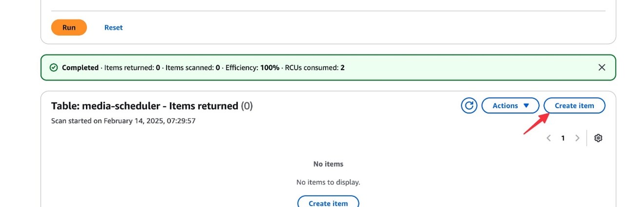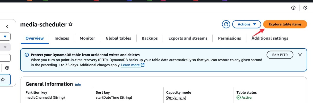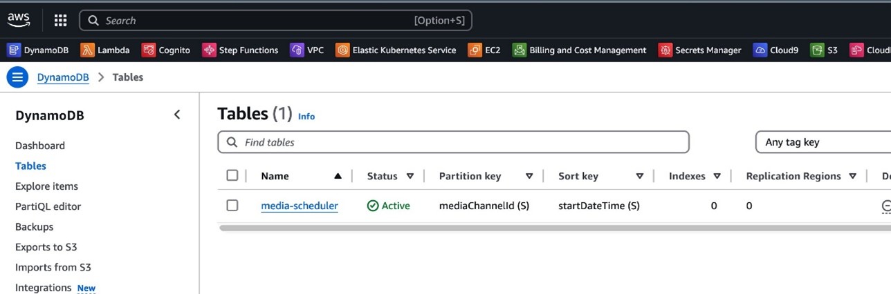 - Navigate to the DynamoDB console You should find a table with name starting with media-scheduler, as shown in the following screenshot.