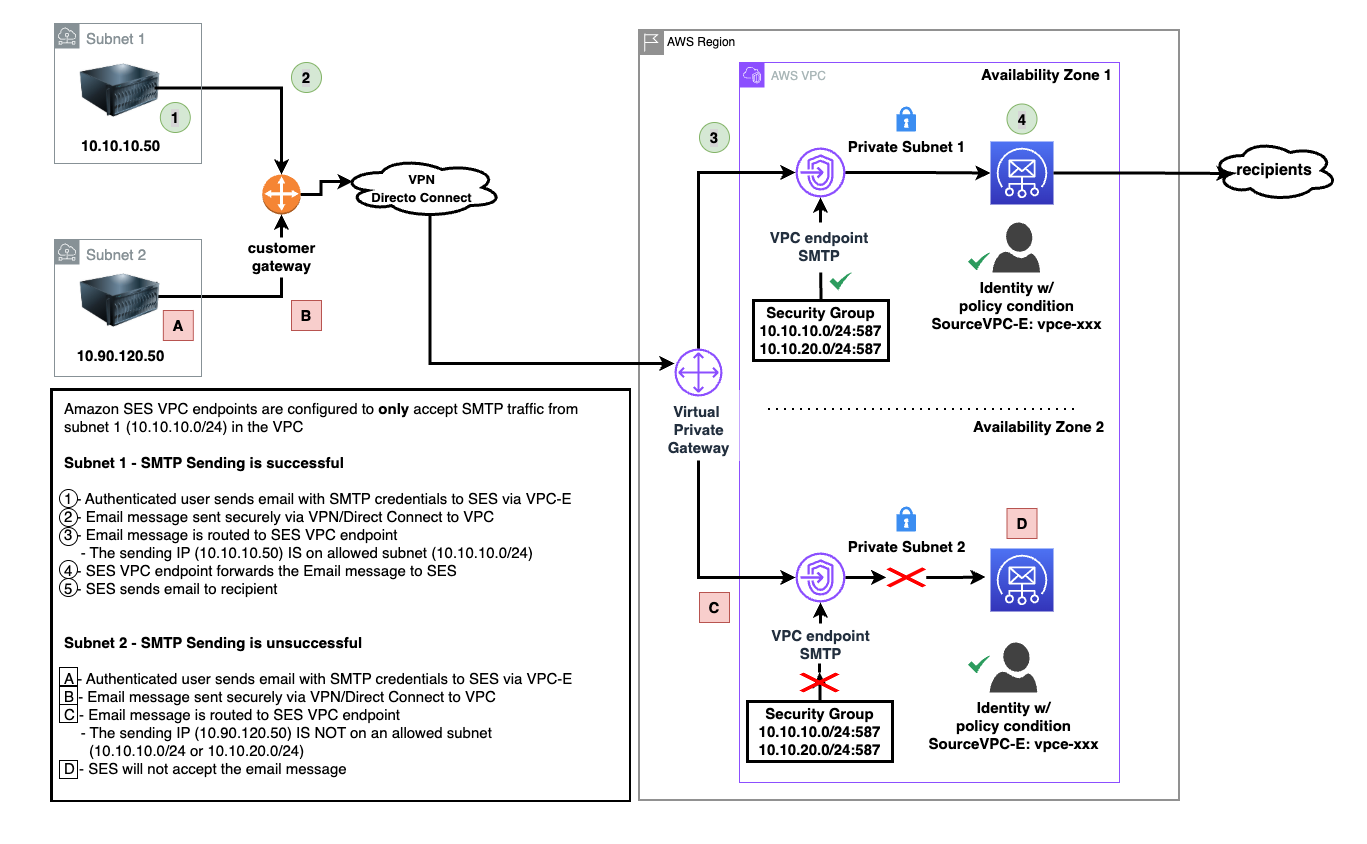 - Traffic on denied subnet B (10.90.120.50) is dropped (not sent to Amazon SES).