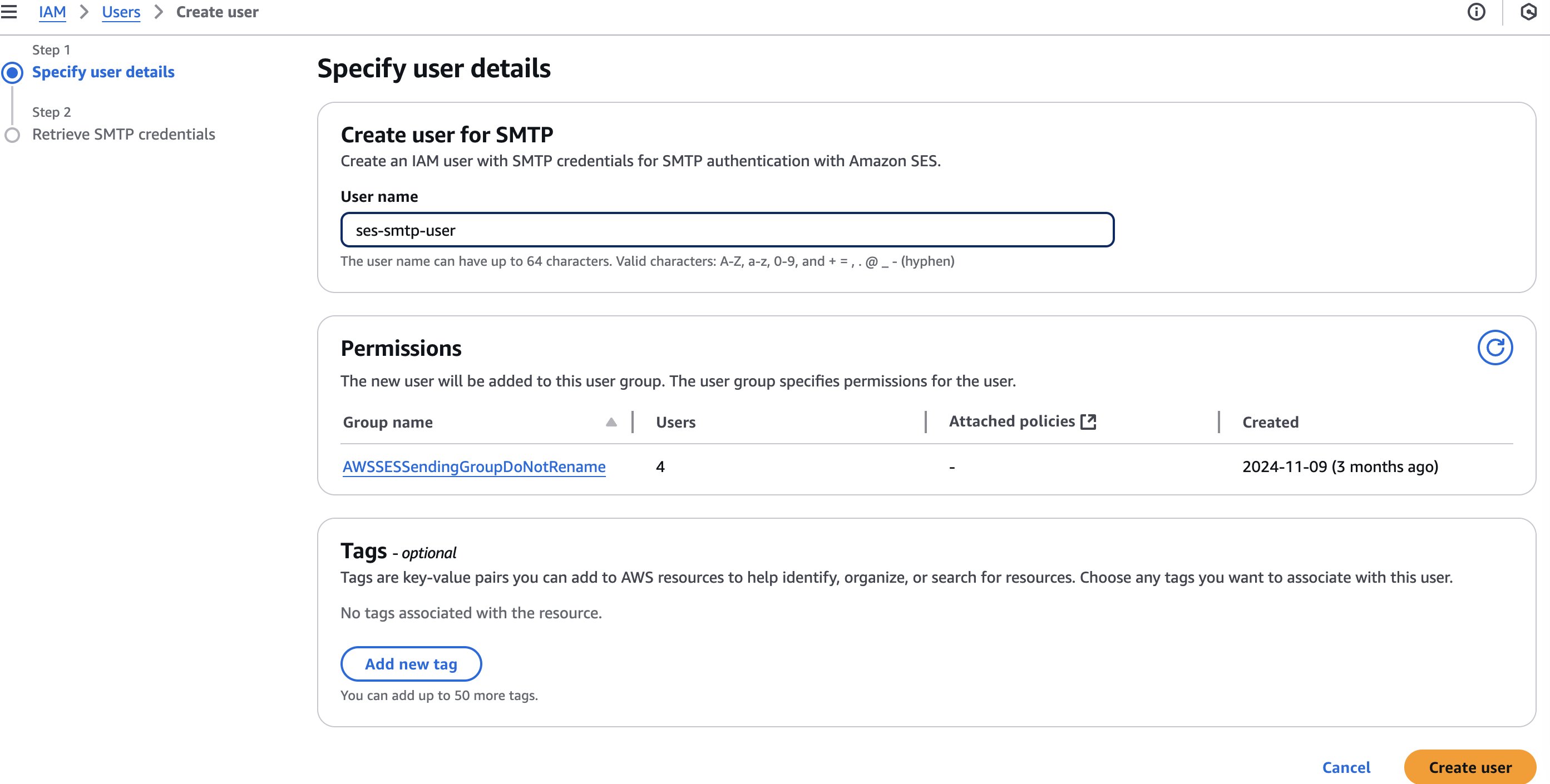 - Download the user’s SMTP credentials or copy the credentials to AWS Secrets Manager. (we will use these SMTP credentials in the next step).
