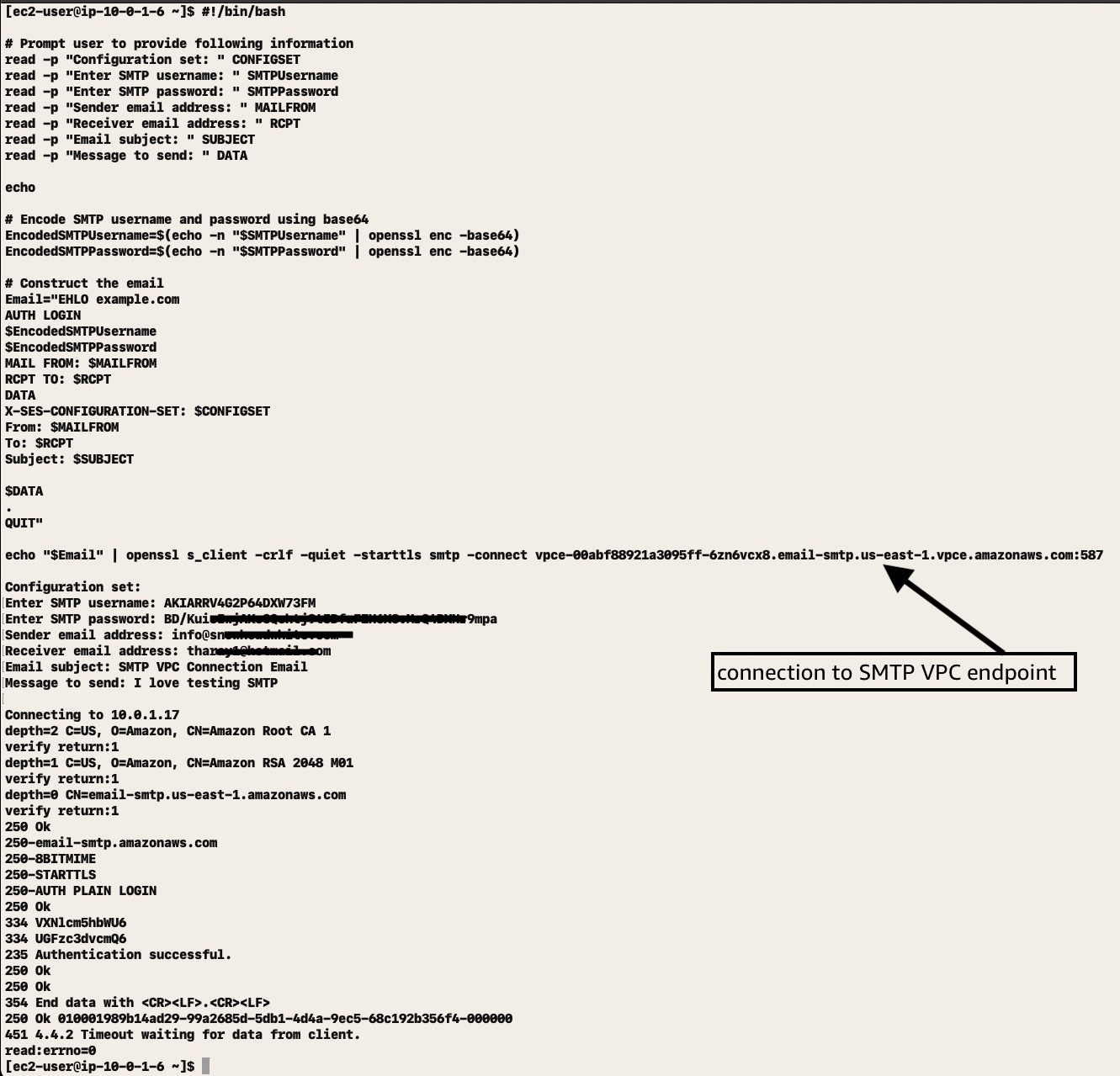 After testing, if you don’t want to keep these configurations you should delete the EC2 instance, the VPC endpoint, the SMTP credential, and the IAM user.