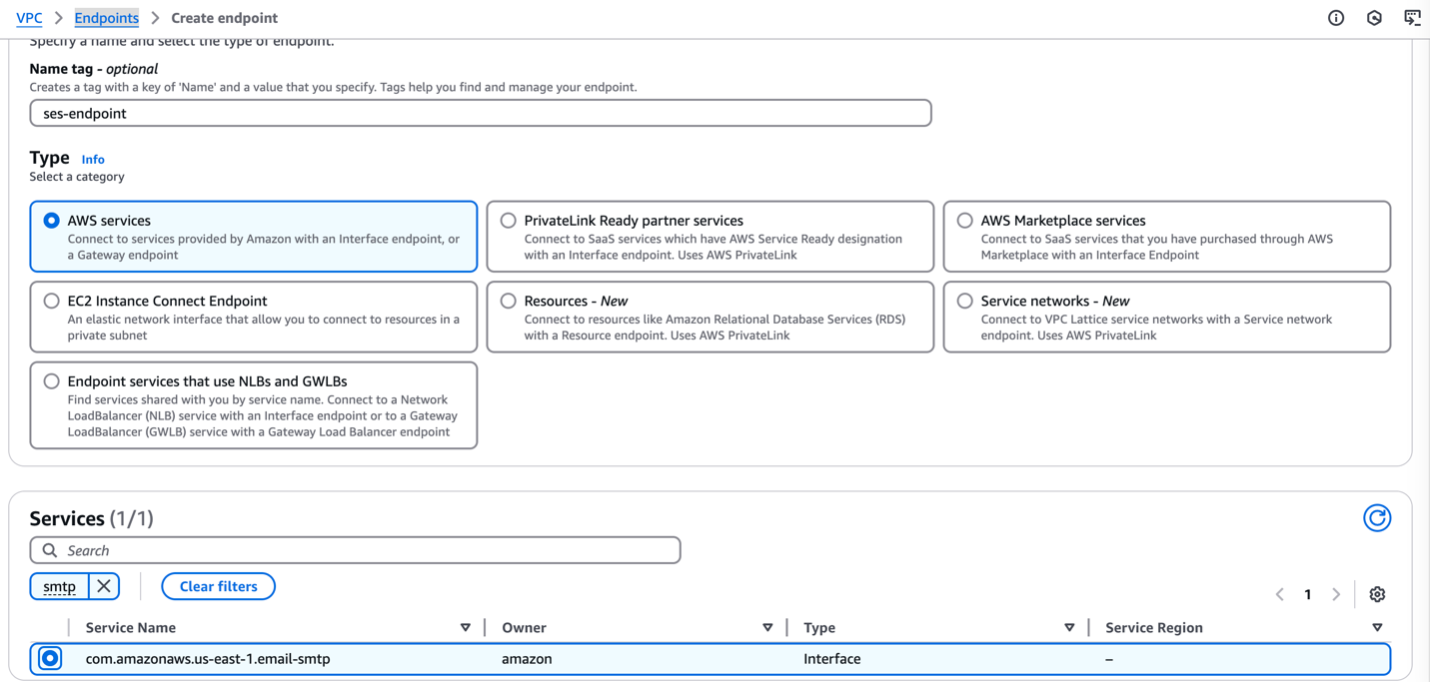 - For VPC, choose the VPC in which you will host the application that will use Amazon SES.