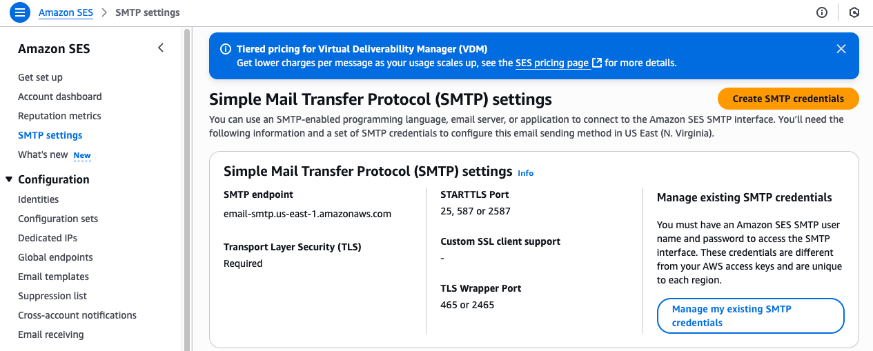- On the Amazon SES console, choose SMTP Settings in the navigation pane.