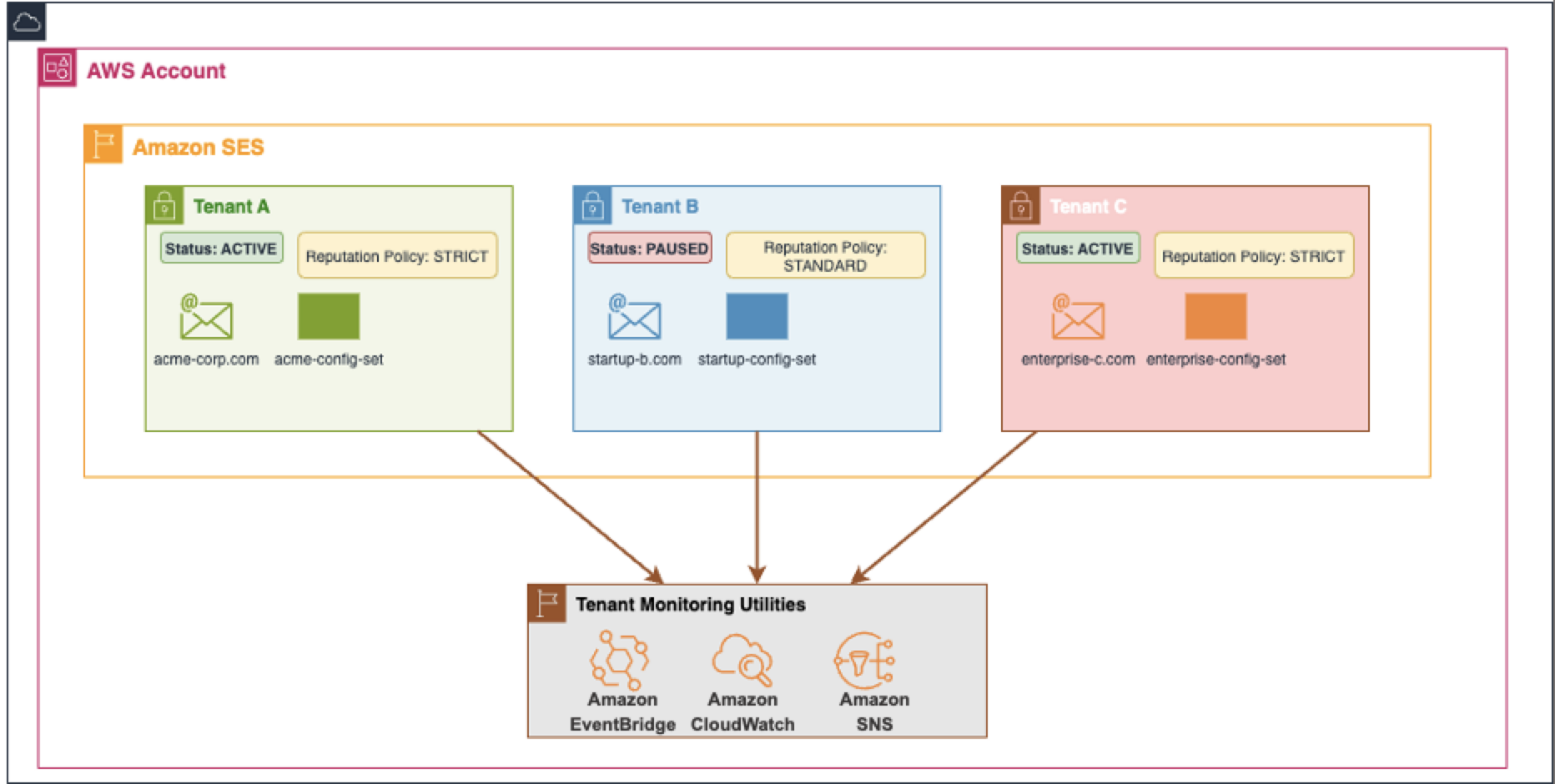 Running multiple users or business units (BUs) on a shared email infrastructure often creates deliverability and compliance risks. The tenant-based reputation isolation feature in Amazon Simple Email Service (Amazon SES) solves these challenges by separating email reputation by customer, BU, or workload. This is part 2 in a series covering the new tenants feature in Amazon Simple Email Service (SES). The first post in this series discussed how users can improve email deliverability with tenant management in Amazon SES (for more details, see the blog post).