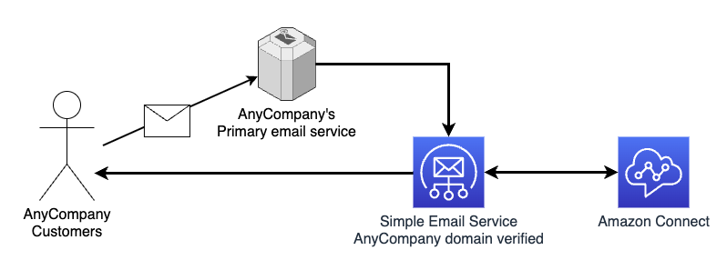 • Emails are routed through your primary email server to Amazon Connect (via Amazon SES)