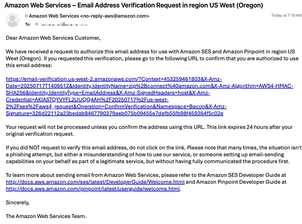 5. Check your work email inbox for the message. Verify the email’s From address is the email address you configured to be sent from Amazon Connect.