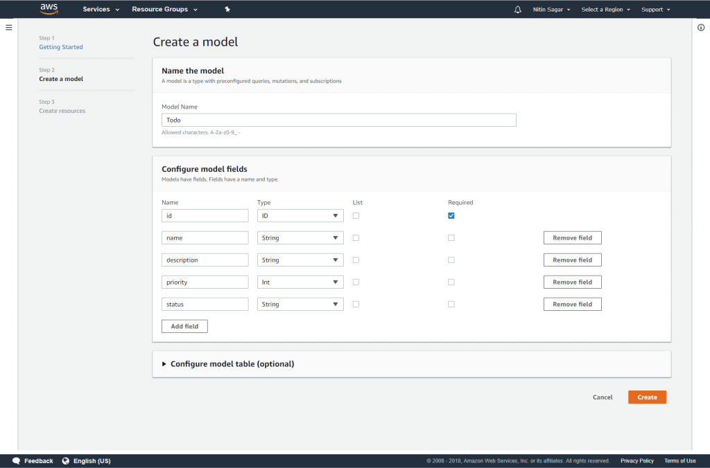 Let’s demonstrate the visual API builder by creating an AWS AppSync API for a “to-do” app that lets you create a list of to-do’s. Before today’s launch, you could create a similar API by following the instructions in the AWS AppSync Developer Guide. (Note that for the purpose of this walkthrough, we changed the data model slightly to use String instead of Enum for the priority field.)