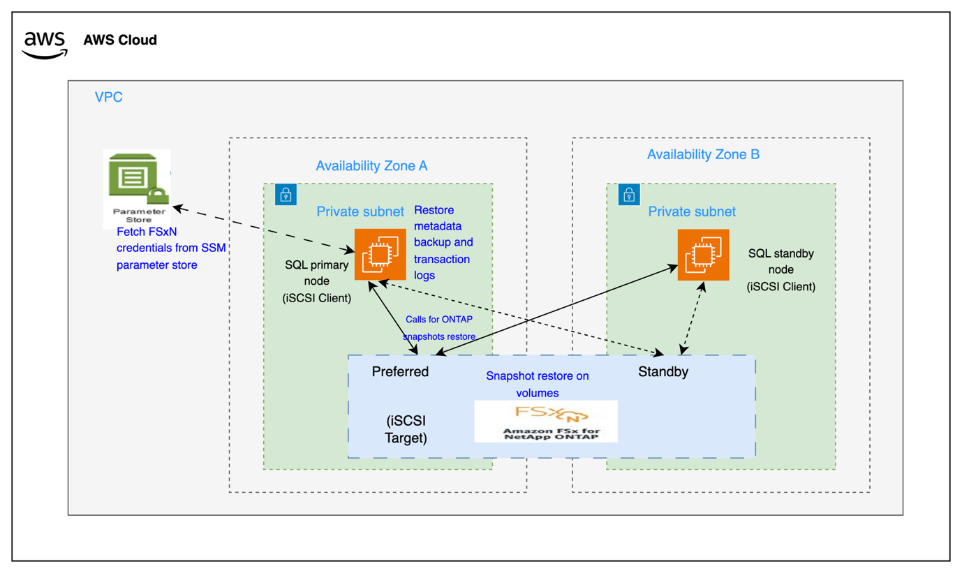 This solution combines SQL Server’s native restore capabilities with FSxN snapshots to provide fast, consistent database restores. The following architecture in Figure 1 shows the key components and their interactions.