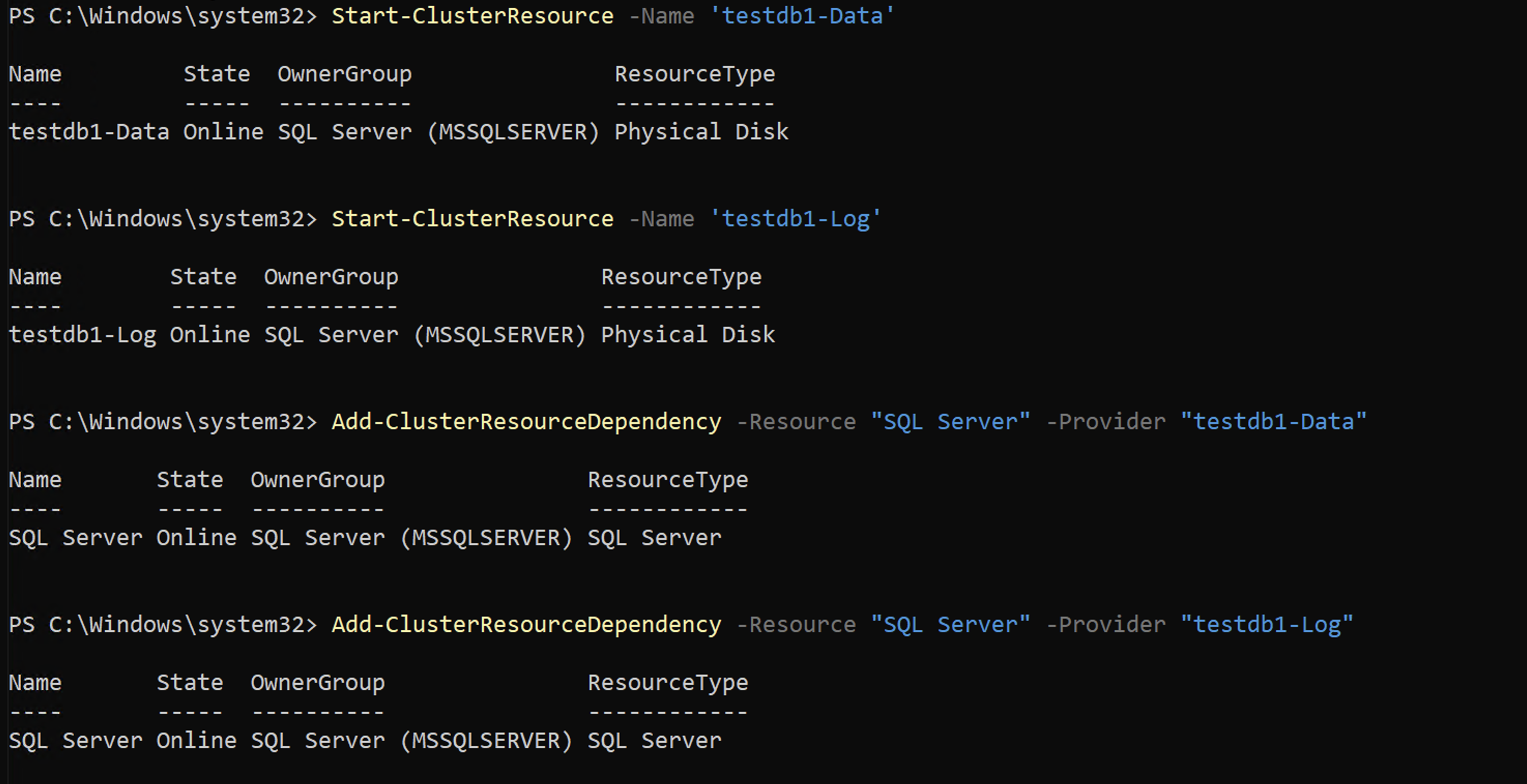 Start-ClusterResource -Name 'testdb1-Data'Start-ClusterResource -Name 'testdb1-Log'