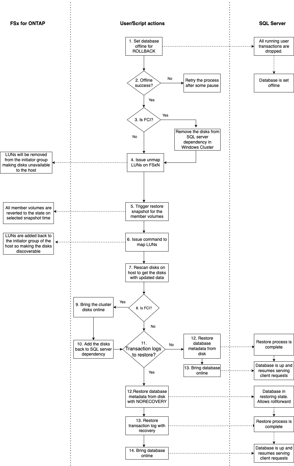 In this post you will learn how to restore SQL Server databases from application-consistent backups using T-SQL commands and FSxN snapshots. This approach reduces database restore times and simplifies the restore process using FSxN snapshots.