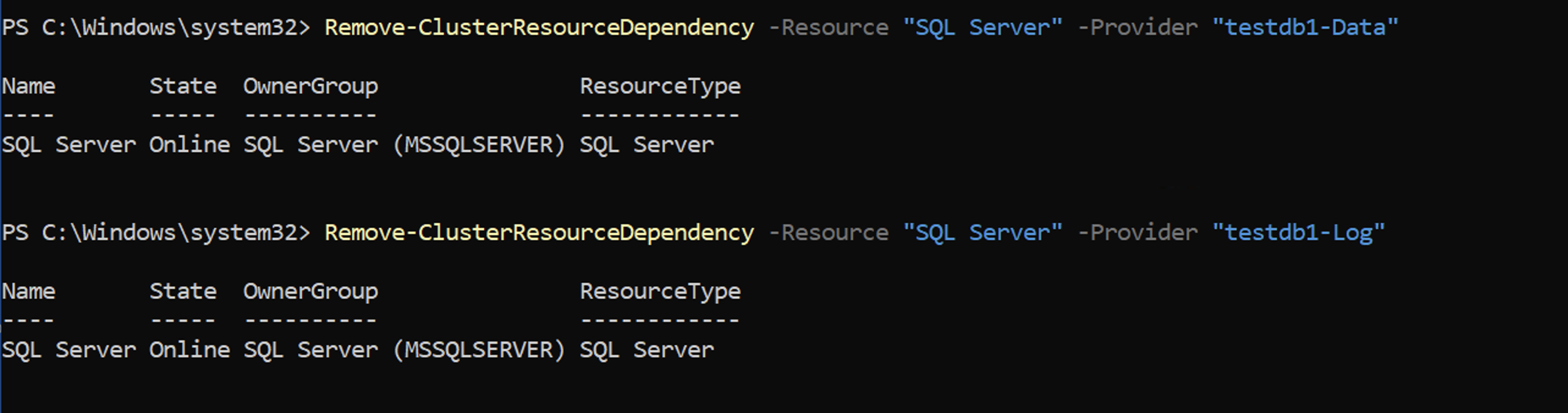 Remove-ClusterResourceDependency -Resource "SQL Server" -Provider "testdb1-Data"