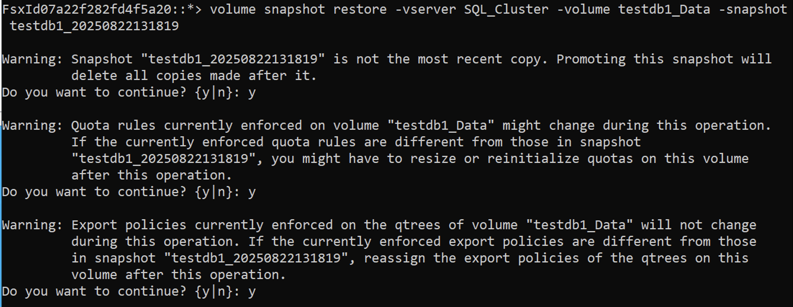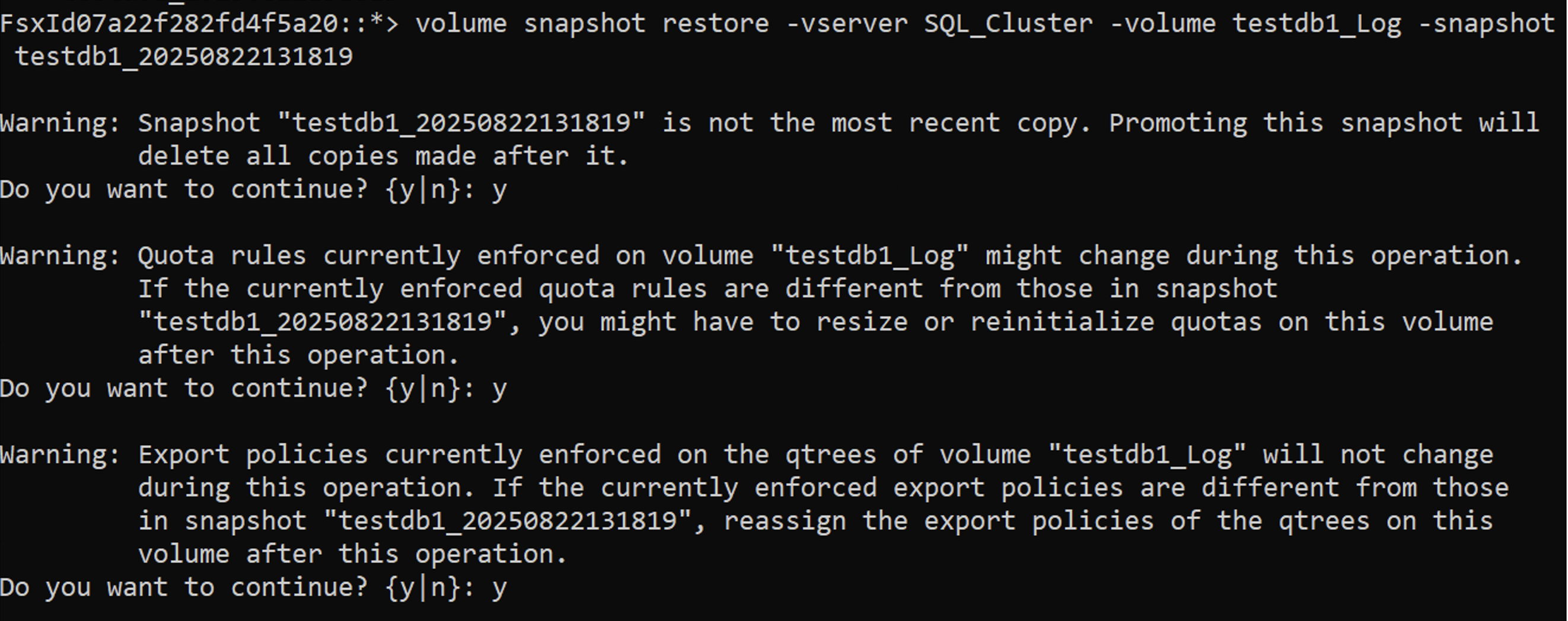 - After unmapping the LUNs, restore data and log volumes from snapshot. Run the following ONTAP commands after connecting to FSxN. Accept the prompts as shown in Figure 7 and Figure 8.