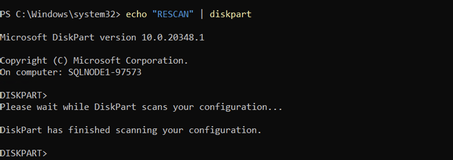 - Rescan the disks on Windows so that it discovers the restored disk. Run below command in PowerShell, as shown in Figure 9.